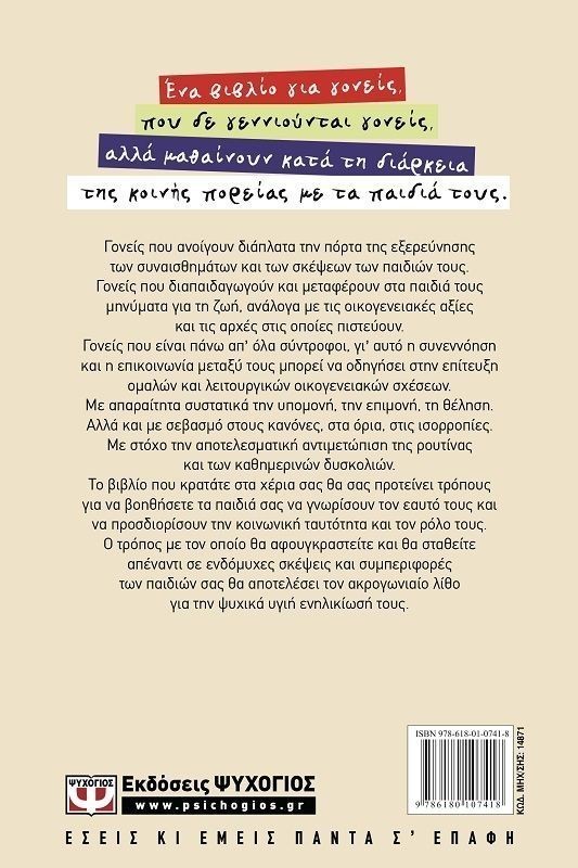 Γονείς που ανοίγουν διάπλατα την πόρτα της εξερεύνησης των συναισθημάτων και των σκέψεων των παιδιών τους. Γονείς που διαπαιδαγωγούν και μεταφέρουν στα παιδιά τους μηνύματα για τη ζωή, ανάλογα με τις οικογενειακές αξίες και τις αρχές στις οποίες πιστεύουν. Γονείς που είναι πάνω απ? όλα σύντροφοι, γι? αυτό η συνεννόηση και η επικοινωνία μεταξύ τους μπορεί να οδηγήσει στην επίτευξη ομαλών και λειτουργικών οικογενειακών σχέσεων. Με απαραίτητα συστατικά την υπομονή, την επιμονή, τη θέληση. Αλλά και με σεβασμό στους κανόνες, στα όρια, στις ισορροπίες. Με στόχο την αποτελεσματική αντιμετώπιση της ρουτίνας και των καθημερινών δυσκολιών. Το βιβλίο που κρατάτε στα χέρια σας θα σας προτείνει τρόπους για να βοηθήσετε τα παιδιά σας να γνωρίσουν τον εαυτό τους και να προσδιορίσουν την κοινωνική ταυτότητα και τον ρόλο τους. Ο τρόπος με τον οποίο θα αφουγκραστείτε και θα σταθείτε απέναντι σε ενδόμυχες σκέψεις και συμπεριφορές των παιδιών σας θα αποτελέσει τον ακρογωνιαίο λίθο για την ψυχικά υγιή ενηλικίωσή τους.