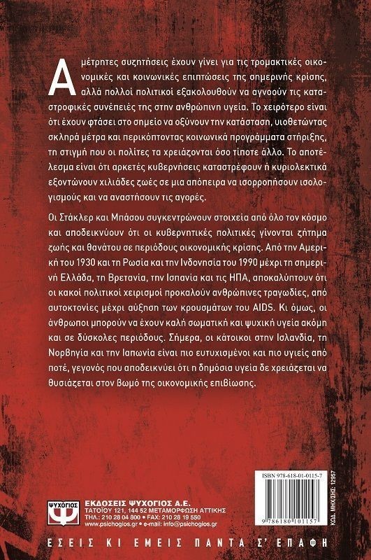 Οι Στάκλερ και Μπάσου συγκεντρώνουν στοιχεία από όλο τον κόσμο και αποδεικνύουν ότι οι κυβερνητικές πολιτικές γίνονται ζήτημα ζωής και θανάτου σε περιόδους οικονομικής κρίσης. Από την Αμερική του 1930 και τη Ρωσία και Ινδονησία του 1990 μέχρι τη σημερινή Ελλάδα, τη Βρετανία, την Ισπανία και τις ΗΠΑ, αποκαλύπτουν ότι οι κακοί πολιτικοί χειρισμοί προκαλούν ανθρώπινες τραγωδίες, από αυτοκτονίες μέχρι αύξηση των κρουσμάτων του AIDS. Κι όμως, οι άνθρωποι μπορούν να έχουν σωματική και ψυχική υγεία ακόμη και σε δύσκολες περιόδους. Σήμερα, οι κάτοικοι στην Ισλανδία, τη Νορβηγία και την Ιαπωνία είναι πιο ευτυχισμένοι και πιο υγιείς από ποτέ, γεγονός που αποδεικνύει ότι η δημόσια υγεία δε χρειάζεται να θυσιάζεται στον βωμό της οικονομικής επιβίωσης.