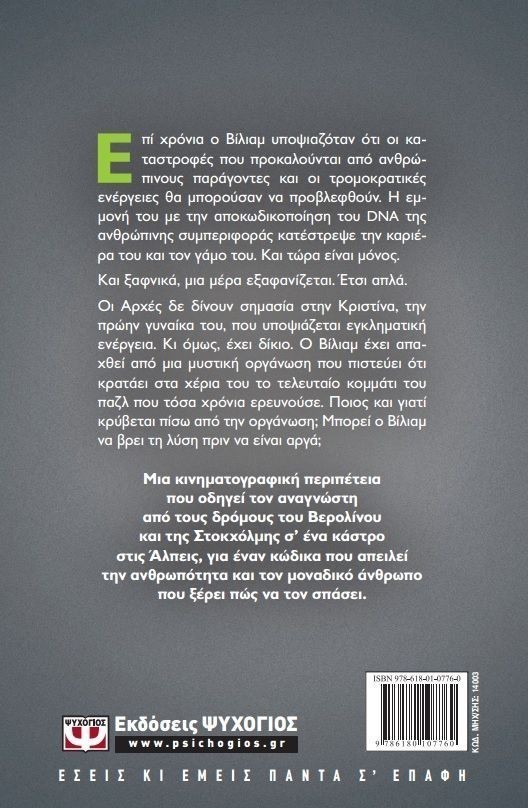 Μια κινηματογραφική περιπέτεια που οδηγεί τον αναγνώστη από τους δρόμους του Βερολίνου και της Στοκχόλμης σ? ένα κάστρο στις ?λπεις, για έναν κώδικα που απειλεί την ανθρωπότητα και τον μοναδικό άνθρωπο που ξέρει πώς να τον σπάσει.