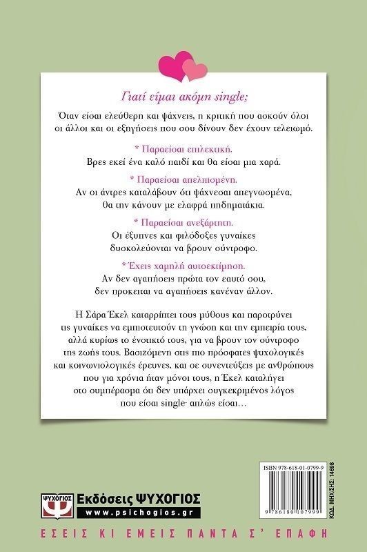 Η Σάρα Έκελ καταρρίπτει τους μύθους και παροτρύνει τις γυναίκες να εμπιστευτούν τη γνώση και την εμπειρία τους, αλλά κυρίως το ένστικτό τους, για να βρουν τον σύντροφο της ζωής τους. Βασιζόμενη στις πιο πρόσφατες ψυχολογικές και κοινωνιολογικές έρευνες, και σε συνεντεύξεις με ανθρώπους που για χρόνια ήταν μόνοι τους, η Έκελ καταλήγει στο συμπέρασμα ότι δεν υπάρχει κάποιος συγκεκριμένος λόγος που είσαι single∙ απλώς είσαι?