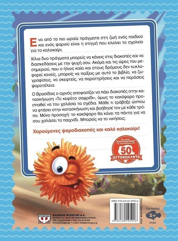 Χίλια δυο πράγματα μπορείς να κάνεις στις διακοπές και να διασκεδάσεις με την ψυχή σου. Ακόμα και τις ώρες του μεσημεριού που ο ήλιος καίει και στους δρόμους δεν κυκλοφορεί κανείς, μπορείς να παίξεις με αυτό το βιβλίο, να ζωγραφίσεις, να σκεφτείς, να παρατηρήσεις και να περάσεις ψαροτέλεια.