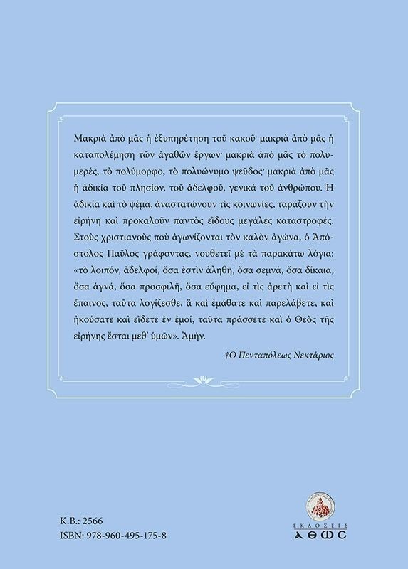| Μακριά από μας η εξυπηρέτηση του κακού. μακριά από μας η καταπολέμηση των αγαθών έργων. μακριά από μας το πολυμερές, το πολύμορφο, το πολυώνυμο ψεύδος. μακριά από μας η αδικία του πλησίον, του αδελφού, γενικά του ανθρώπου. Η αδικία και το ψέμα, αναστατώνουν τις κοινωνίες, ταράζουν την ειρήνη και προκαλούν παντός είδους μεγάλες καταστροφές. Στους χριστιανούς που αγωνίζονται τον καλόν αγώνα, ο Απόστολος Παύλος γράφοντας, νουθετεί με τα παρακάτω λόγια: «το λοιπόν, αδελφοί, όσα εστίν αληθή, όσα σεμνά, όσα δίκαια, όσα αγνά, όσα προσφιλή, όσα εύφημα, ει τις αρετή και ει τις έπαινος, ταύτα λογίζεσθε, α και εμάθατε και παρελάβετε, και ηκούσατε και είδετε εν εμοί, ταύτα πράσσετε και ο Θεός της ειρήνης έσται μεθ' υμών». Αμήν. ?Ο Πενταπόλεως Νεκτάριος |