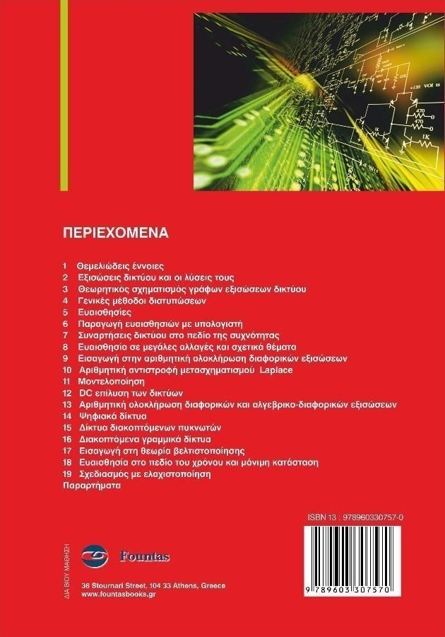 1. Θεμελιώδεις Έννοιες. 2. Εξισώσεις Δικτύου και οι Λύσεις τους. 3. Θεωρητικός Σχηματισμός Γράφων Εξισώσεων Δικτύου 4. Γενικές Μέθοδοι Διατυπώσεων. 5 Ευαισθησίες. 6. Παραγωγή Ευαισθησιών με Υπολογιστή. 7. Συναρτήσεις Δικτύου στο Πεδίο της Συχνότητας. 8. Ευαισθησία σε Μεγάλες Αλλαγές και Σχετικά Θέματα 9. Εισαγωγή στην Αριθμητική Ολοκλήρωση Διαφορικών Εξισώσεων. 10. Αριθμητική Αντιστροφή Μετασχηματισμού Laplace. 11. Μοντελοποίηση. 12. DC Επίλυση των Δικτύων. 13. Αριθμητική Ολοκλήρωση Διαφορικών και Αλγεβρικο-διαφορικών Εξισώσεων. 14. Ψηφιακά Δίκτυα. 15. Δίκτυα Διακοπτόμενων Πυκνωτών 16. Διακοπτόμενα Γραμμικά Δίκτυα 17. Εισαγωγή στη Θεωρία Βελτιστοποίησης 18. Ευαισθησίες στο Πεδίο του Χρόνου και Μόνιμη Κατάσταση. 19. Σχεδιασμός με Ελαχιστοποίηση. 20. Μέθοδοι Ειδικών Αναλύσεων. Παράρτημα Α. Μετασχηματισμός Laplace. Παράρτημα Β. Ανάλυση Ρητών Συναρτήσεων σε Απλά Κλάσματα. Παράρτημα C. Επιλεγμένα Μαθηματικά Θέματα.