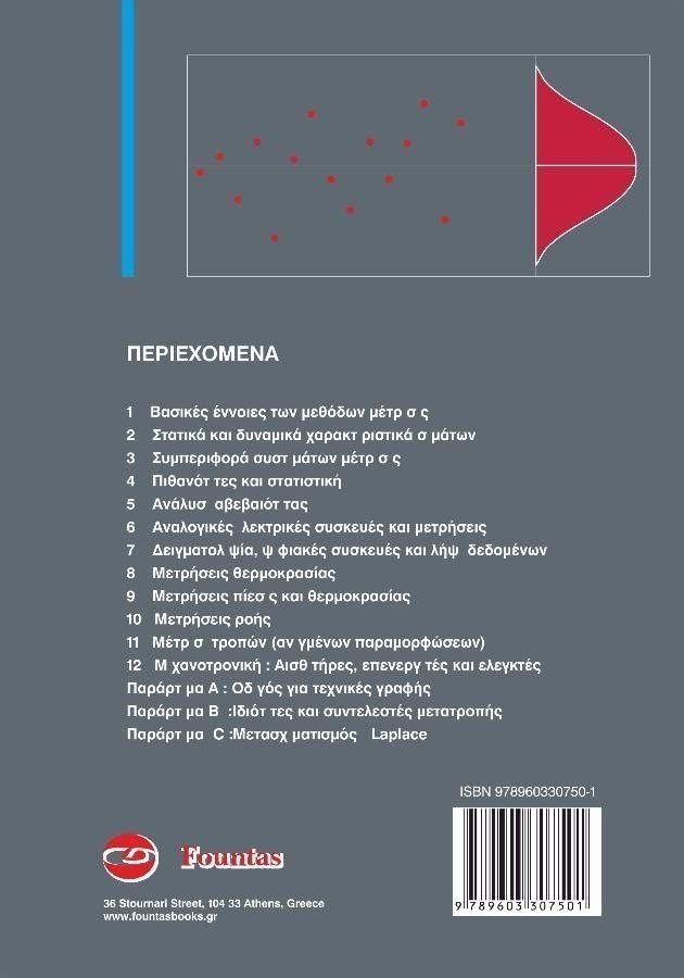 ΠΕΡΙΕΧΟΜΕΝΑ : 1. Βασικές έννοιες μεθόδων Μέτρησης. 2. Στατικά και δυναμικά χαρακτηριστικά σημάτων. 3. Συμπεριφορά συστημάτων μέτρησης. 4. Πιθανότητες και στατιστική. 5. Ανάλυση αβεβαιότητας. 6. Αναλογικές ηλεκτρικές συσκευές και μετρήσεις. 7. Δειγματοληψία, ψηφιακές συσκευές και λήψη δεδομένων. 8. Μετρήσεις θερμοκρασίας. 9. Μετρήσεις πίεσης και ταχύτητας. 10. Μετρήσεις ροής. 11. Μετρήσεις παραμορφώσεων (?τροπών?). 12. Μηχανοτρονική. Αισθητήρες, Επενεργητές και Ελεγκτές. Παραρτήματα.