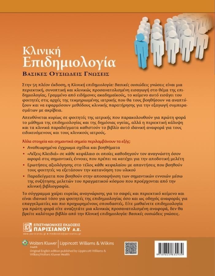Είτε μελετάτε επιδημιολογία για πρώτη φορά είτε αναζητάτε μια κλινικώς προσανατολισμένη αναφορά, δεν θα βρείτε καλύτερο εγχειρίδιο από την Κλινική επιδημιολογία: Βασικά σημεία. Απευθύνεται ως επί το πλείστον σε φοιτητές ιατρικής που παρακολουθούν για πρώτη φορά το μάθημα της επιδημιολογίας και της δημόσιας υγείας, ωστόσο η διεξοδική κάλυψη της ύλης και τα κλινικά παραδείγματα καθιστούν το βιβλίο ιδανική και απαραίτητη αναφορά για τους ειδικευόμενους και κλινικούς ιατρούς. Γραμμένο από κορυφαίους επιστήμονες, με έγχρωμα και πολύ ουσιαστικά σχέδια και γραφήματα, λέξεις-κλειδιά σε κάθε του κεφάλαιο και ερωτήσεις ανακεφαλαίωσης με απαντήσεις όπου και αξιολογείται η κατανόηση της ύλης, το βιβλίο Κλινική επιδημιολογία: Βασικά σημεία δεν πρέπει να λείπει από κανέναν φοιτητή ιατρικής.