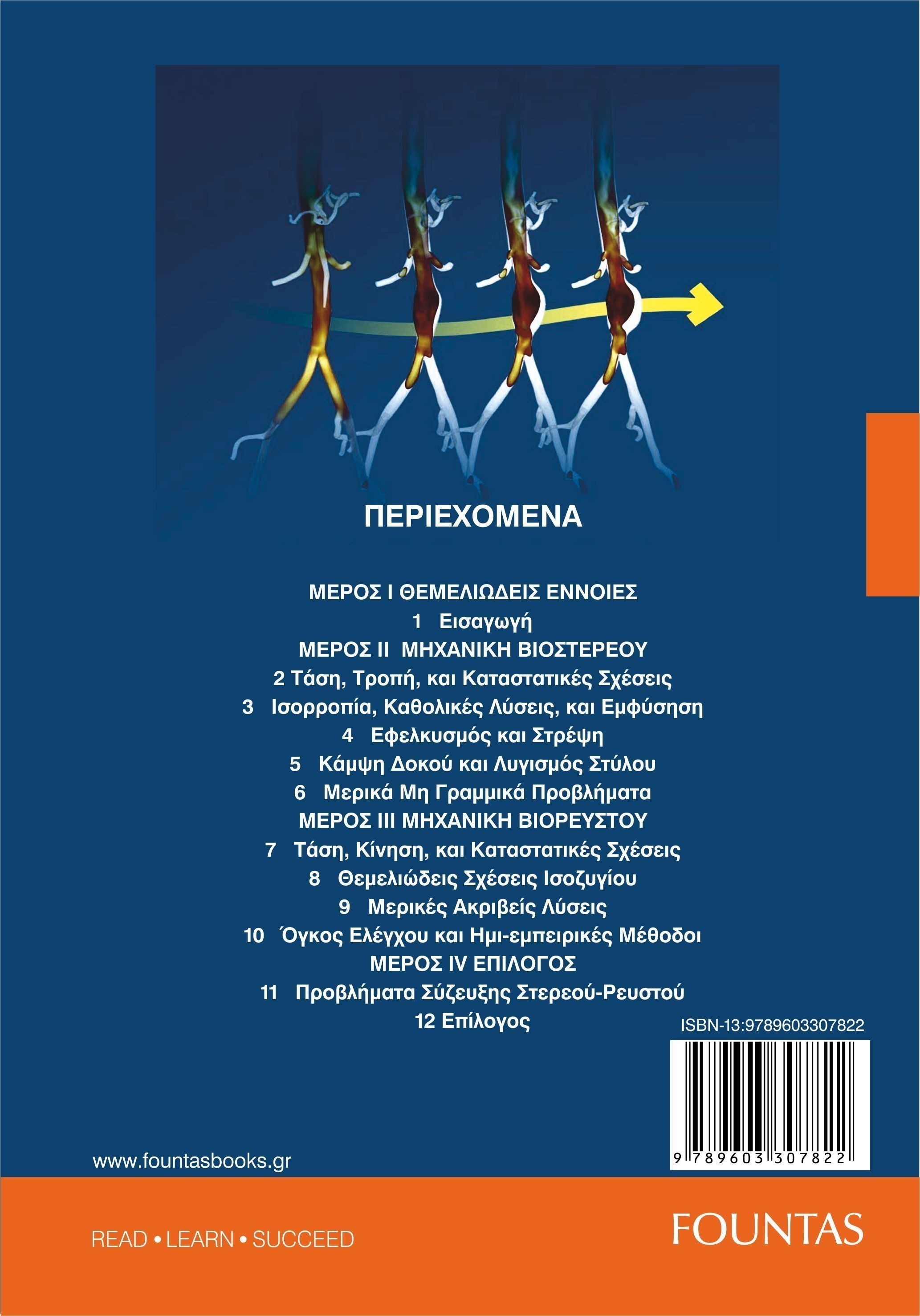 ΠΕΡΙΕΧΟΜΕΝΑ ΜΕΡΟΣ Ι ΘΕΜΕΛΙΩΔΕΙΣ ΕΝΝΟΙΕΣ 1 Εισαγωγή ΜΕΡΟΣ ΙΙ ΜΗΧΑΝΙΚΗ ΒΙΟΣΤΕΡΕΟΥ 2 Τάση, Τροπή, και Καταστατικές Σχέσεις 3 Ισορροπία, Καθολικές Λύσεις, και Εμφύσηση 4 Εφελκυσμός και Στρέψη 5 Κάμψη Δοκού και Λυγισμός Στύλου 6 Μερικά Μη Γραμμικά Προβλήματα ΜΕΡΟΣ ΙΙΙ ΜΗΧΑΝΙΚΗ ΒΙΟΡΕΥΣΤΟΥ 7 Τάση, Κίνηση, και Καταστατικές Σχέσεις 8 Θεμελιώδεις Σχέσεις Ισοζυγίου 9 Μερικές Επακριβείς Λύσεις 10 Όγκος Ελέγχου και Ημι-εμπειρικές Μέθοδοι ΜΕΡΟΣ IV ΕΠΙΛΟΓΟΣ 11 Προβλήματα Σύζευξης Στερεού-Ρευστού 12 Επίλογος.