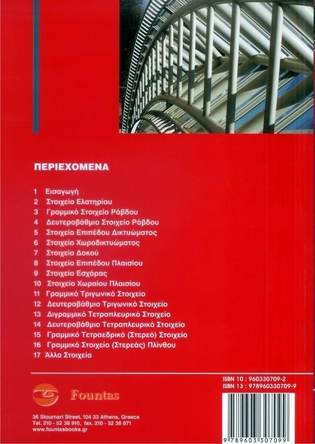 Το πιό σύγχρονο , κατανοητό και λειτουργικό βιβλίο του κόσμου . Μαθαίνετε εύκολα και γρήγορα στατική γραμμικών , αλλά και επιφανειακών φορέων. Μπορείτε να το χρησιμοποιείτε για την επίλυση οποιουδήποτε φορέα με μητρωϊκές μεθόδους. Θεωρία , πολλά παραδείγματα και ασκήσεις με τις πλήρεις λύσεις τους . Επίσης , όλα τα απαραίτητα προγράμματα σε συνοδό CD-ROM .