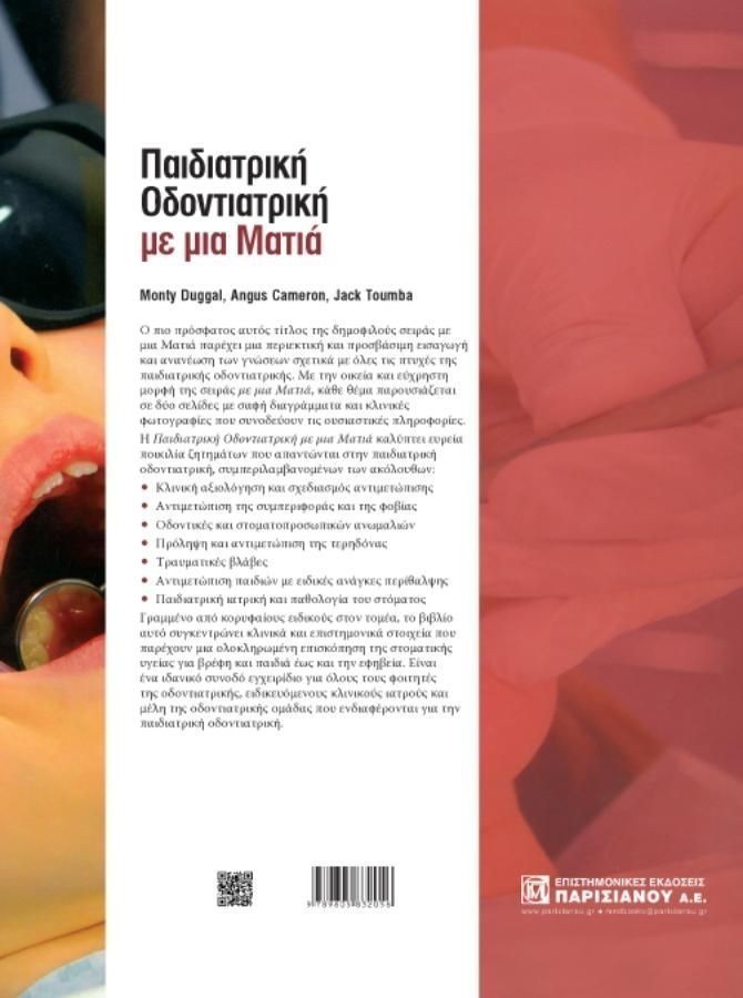 Ο πιο πρόσφατος αυτός τίτλος της δημοφιλούς σειράς με μια Ματιά παρέχει μια περιεκτική και προσβάσιμη εισαγωγή και ανανέωση των γνώσεων σχετικά με όλες τις πτυχές της παιδιατρικής οδοντιατρικής. Με την οικεία και εύχρηστη μορφή της σειράς με μια Ματιά, κάθε θέμα παρουσιάζεται σε δύο σελίδες με σαφή διαγράμματα και κλινικές φωτογραφίες που συνοδεύουν τις ουσιαστικές πληροφορίες.