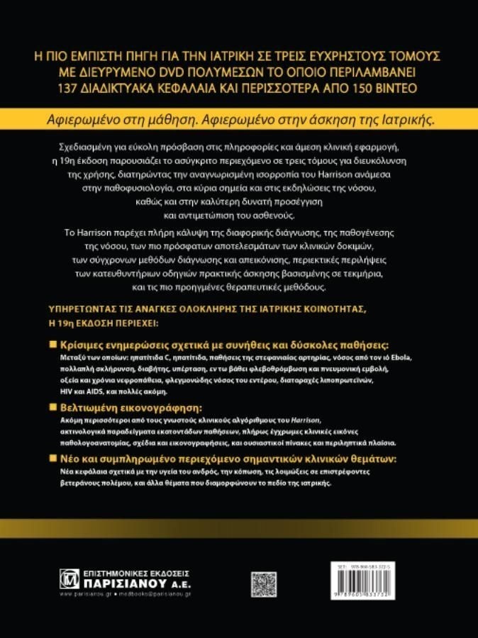 Διατηρώντας τους στόχους του Harrison, η παρούσα έκδοση τροποποιήθηκε εκτενώς υπό το φως των ποικίλων αναγκών των αναγνωστών του βιβλίου, καθώς και των πολλαπλών μεθόδων και μορφών διά των οποίων αποκτάται αλλά και χρησιμοποιείται σήμερα η πληροφορία. Το κέντρο βάρους της ιατρικής εκπαίδευσης παγκοσμίως μετατοπίζεται από την κλασική προσέγγιση δομή/λειτουργία/νόσημα σε μια εμπεριστατωμένη και συχνά βασιζόμενη στο εκάστοτε περιστατικό προσέγγιση, στην οποία θετικές και πληθυσμιακές επιστήμες συνδέονται ειδικώς με την πρακτική διάγνωση και την αντιμετώπιση της νόσου. Μεγάλο μέρος των ενημερώσεων και των αλλαγών που περιγράφονται εδώ έγιναν, λαμβάνοντας υπ? όψιν τα σύγχρονα εκπαιδευτικά και κλινικά περιβάλλοντα. Η ανά χείρας καινούργια έκδοση προσφέρει μια εκτενώς ενημερωμένη παρουσίαση της κλασικής παθοφυσιολογικής βάσης της κλινικής ιατρικής και περιγράφει λεπτομερώς τις μεθόδους και τα εργαλεία αιχμής, που τώρα είναι διαθέσιμα για την εκτίμηση των συμπτωμάτων και την αποτελεσματική αντιμετώπιση των ασθενειών στο σύγχρονο περιβάλλον υγειονομικής περίθαλψης. Το κυρίως κείμενο συμπληρώνουν καινούργιες φωτογραφίες, ακτινογραφίες, εικόνες, γραφήματα, ειδικοί αλγόριθμοι για τη φροντίδα του ασθενούς, πίνακες, καθώς και πρακτικά πληροφοριακά βίντεο. Έχοντας ως στόχο το βιβλίο να γίνει όσο το δυνατόν πιο εύχρηστο, χρησιμοποιήθηκε ένα νέο σύστημα παραπομπών. Λεπτομερείς βιβλιογραφικοί κατάλογοι, με περιλήψεις σχετικών άρθρων υπάρχουν στη διαδικτυακή έκδοση, αντικαθιστώντας τη γενική και περιορισμένη συλλογή των επιμέρους βιβλιογραφικών πηγών, οι οποίες στις προηγούμενες έντυπες εκδόσεις υπήρχαν στο τέλος κάθε κεφαλαίου. Η 19η έκδοση της «Εσωτερικής Παθολογίας» συνεχίζει την πολυετή παράδοση και την επιτυχή πορεία και, ανανεωμένη και ενημερωμένη με τις πρόσφατες επιστημονικές ανακαλύψεις, έρχεται να διεκδικήσει μια θέση στη βιβλιοθήκη του φοιτητή της Ιατρικής, αλλά και του κλινικού ιατρού ή του νοσηλευτή. Ο 2ος τόμος καλύπτει εις βάθος ζητήματα που αφορούν στην ογκολογία και την αιματολογία, στα λοιμώδη νοσήματα, και στη βιοτρομοκρατία. Έχουν γίνει σημαντικές ενημερώσεις στο κλασικό κεφάλαιο για το AIDS, που προσφέρει τόσο μια κλινικά πραγματιστική εστίαση όσο και μια περιεκτική και ουσιαστική προσέγγιση της παθογένεσης. Οι ενημερώσεις περιλαμβάνουν τα πιο πρόσφατα θεραπευτικά πρωτόκολλα και εξετάζουν το ζήτημα των συνδυαστικών τρόπων πρόληψης, καθιστώντας αυτό το κεφάλαιο την πιο ενημερωμένη και πλήρη πραγμάτευση του HIV που είναι διαθέσιμη επί του παρόντος. ?λλα καινούργια κεφάλαια αφορούν σε επίκαιρα θέματα όπως η χρόνια μυελοειδής λευχαιμία, οι λοιμώξεις στους βετεράνους που επιστρέφουν από πολέμους, καθώς και τα μείζονα χαρακτηριστικά των ελμινθών και των ελμινθιάσεων