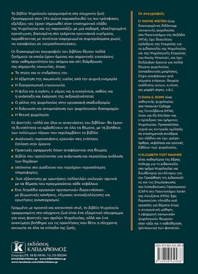 Το βιβλίο Ψυχολογία εφαρμοσμένη στη σύγχρονη ζωή: Προσαρμογή στον 21ο αιώνα παρακολουθεί τις πιο πρόσφατες εξελίξεις που έχουν σημειωθεί στον επιστημονικό κλάδο της Ψυχολογίας και τις παρουσιάζει με μια σοβαρή, ολοκληρωμένη προσέγγιση, βασισμένη στα τρέχοντα ερευνητικά ευρήματα, παραθέτοντας με συνέπεια τεκμηριωμένα συμπεράσματα χωρίς να καταφεύγει σε υπεραπλουστεύσεις. Γραμμένο με προσιτό και κατανοητό στυλ, είναι ένα εξαιρετικό σύγγραμμα για τους φοιτητές των σχολών Ψυχολογίας, αλλά και ένα ανεκτίμητο βοήθημα για τις προκλήσεις που θέτει η σύγχρονη κοινωνία σε όλα τα επίπεδα της ζωής.