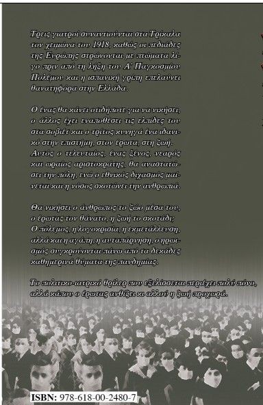Τρεις γιατροί συναντιούνται στα Τρίκαλα τον χειμώνα του 1918, καθώς οι πεδιάδες της Ευρώπης στρώνονται με πτώματα λίγο πριν από τη λήξη του Α' Παγκοσμίου Πολέμου και η ισπανική γρίπη επελαύνει θανατηφόρα στην Ελλάδα. Ο ένας θα κάνει οτιδήποτε για να νικήσει, ο άλλος έχει εναποθέσει τις ελπίδες του στα σοβιέτ και ο τρίτος κυνηγά ένα ιδανικό στην επιστήμη, στον έρωτα, στη ζωή. Αυτός ο τελευταίος, ένας ξένος, νεαρός και ωραίος αριστοκράτης, θα αναστατώσει την πόλη, ενώ ο εθνικός διχασμός μαίνεται και η νόσος σκοτώνει την ανθρωπιά. Θα νικήσει ο άνθρωπος το ζώο μέσα του, ο έρωτας τον θάνατο, η ζωή το σκοτάδι; Ο πόλεμος, η λογοκρισία, η εκμετάλλευση, αλλά και η αγάπη, η αυταπάρνηση, ο ηρωισμός συγκρούονται πάνω από τα δεκάδες καθημερινά θύματα της πανδημίας. Το πολιτικο-ιατρικό θρίλερ που εξελίσσεται περιέχει πολύ πόνο, αλλά κάπου ο έρωτας ανθίζει κι αλλού η ζωή προχωρά. Ο Δμήτρης Λάμπρου είναι δημοσιογράφος και συγγραφέας .Σπούδασε στο Πάντειο Πανεπιστήμιο Διεθνολόγος και Πολιτικός Επιστήμων .'Εχει δημοσιεύσει μελέτες ιστορικού περιεχομένου και σειρά άρθρων για την Ελληνική γλώσσα. Το 2016 κυκλοφόρησε το πρώτο του ιστορικό μυθιστόρημα με τίτλο: Ο Σύντομος Χειμώνας της Ληστοκρατίας .