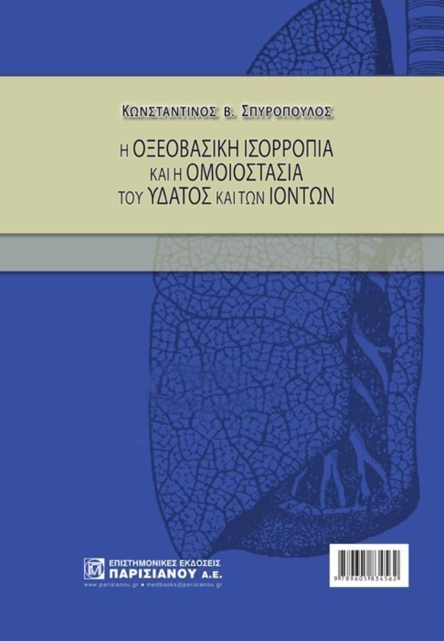 Η οξεοβασική ισορροπία και η ομοιοστασία του ύδατος και των ιόντων του Κωνσταντίνου Β. Σπυρόπουλου είναι ένα εγχειρίδιο που έχει στόχο να παρουσιάσει, με εύληπτο και ανάγλυφο τρόπο, τον τρόπο διακίνησης του ύδατος, των ιόντων, των οξέων και των βάσεων εντός του ανθρώπινου σώματος. Προκειμένου να εξηγηθούν τόσο η οξεοβασική ισορροπία όσο και οι μεταβολές της, το βιβλίο περιλαμβάνει θέματα όπως η ομοιοστασία του ύδατος, του νατρίου, του καλίου και των άλλων ιόντων, διαταραχές όπως η υποκαλιαιμία και η υπερκαλιαιμία, καθώς και ο τρόπος λειτουργίας του επεμβατικού και μη επεμβατικού μηχανικού αερισμού. Οι ερωτήσεις αυτοαξιολόγησης που παρατίθενται στο τέλος του βιβλίου είναι ένα επιπλέον στοιχείο που καθιστά το εγχειρίδιο χρήσιμο για κάθε φοιτητή, επιστήμονα ή κλινικό ερευνητή που θέλει να ασχοληθεί σε βάθος με το θέμα της οξεοβασικής ισορροπίας. Η οξεοβασική ισορροπία και η ομοιοστασία του ύδατος και των ιόντων είναι σίγουρα ένα πόνημα που ικανοποιεί τον απαιτητικό αναγνώστη και αναμφίβολα έχει θέση σε κάθε σύγχρονη και ενημερωμένη επιστημονική βιβλιοθήκη.