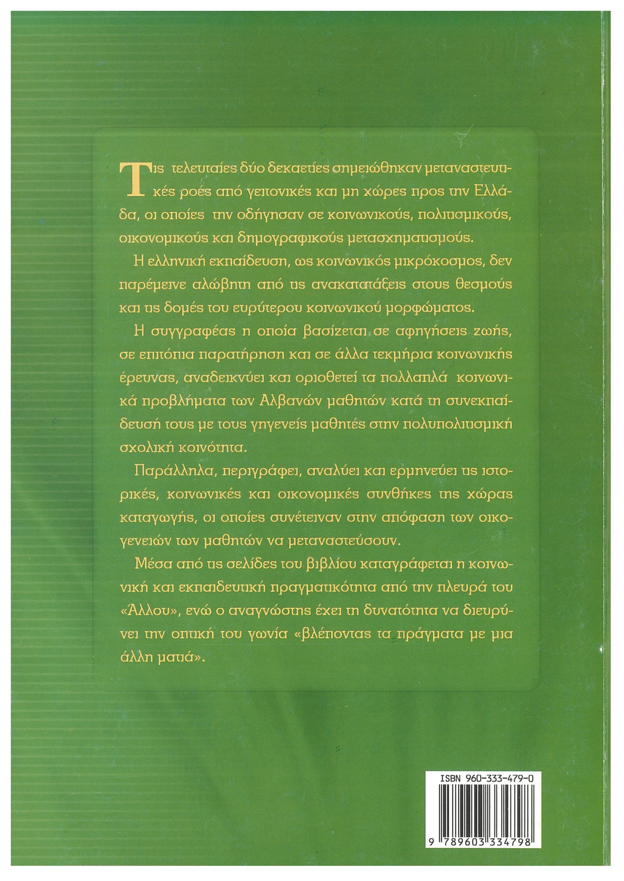 Τις τελευταίες δύο δεκαετίες σημειώθηκαν μεταναστευτικές ροές από γειτονικές και μη χώρες προς την Ελλάδα, οι οποίες την οδήγησαν σε κοινωνικούς, πολιτισμικούς, οικονομικούς και δημογραφικούς μετασχηματισμούς. Η ελληνική εκπαίδευση, ως κοινωνικός μικρόκοσμος, δεν παρέμεινε αλώβητη από τις ανακατατάξεις στους θεσμούς και τις δομές του ευρύτερου κοινωνικού μορφώματος. Η συγγραφέας, η οποία βασίζεται σε αφηγήσεις ζωής, σε επιτόπια παρατήρηση και σε άλλα τεκμήρια κοινωνικής έρευνας, αναδεικνύει και οριοθετεί τα πολλαπλά κοινωνικά προβλήματα των Αλβανών μαθητών κατά τη συνεκπαίδευσή τους με τους γηγενείς μαθητές στην πολυπολιτισμική σχολική κοινότητα. Παράλληλα, περιγράφει, αναλύει και ερμηνεύει τις ιστορικές, κοινωνικές και οικονομικές συνθήκες της χώρας καταγωγής, οι οποίες συνέτειναν στην απόφαση των οικογενειών των μαθητών να μεταναστεύσουν. Μέσα από τις σελίδες του βιβλίου καταγράφεται η κοινωνική και εκπαιδευτική πραγματικότητα από την πλευρά του «'Αλλου», ενώ ο αναγνώστης έχει τη δυνατότητα να διευρύνει την οπτική του γωνία «βλέποντας τα πράγματα με μια άλλη ματιά».