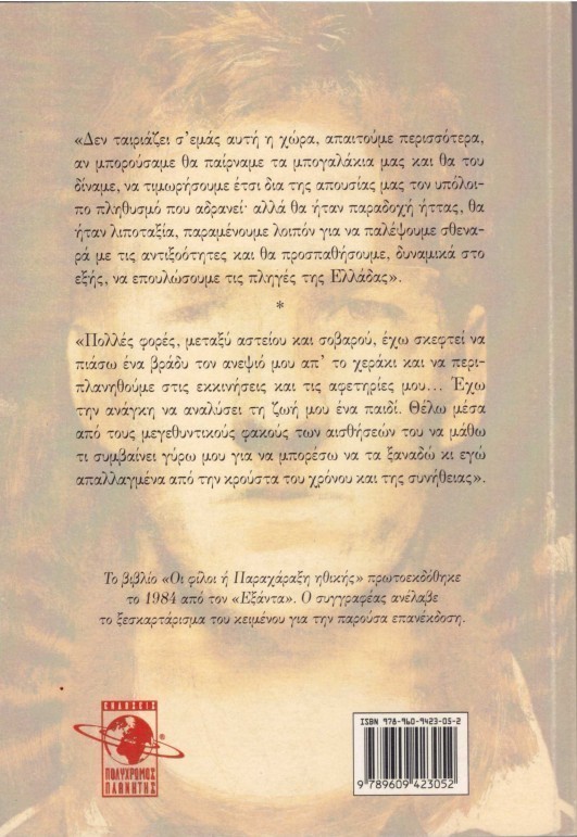 Το "μυθιστόρημα" του Γιάννη Παλαμιώτη "Οι φίλοι ή Παραχάραξη ηθικής", που επανεκδίδεται από τον Πολύχρωμο Πλανήτη 26 χρόνια μετά την αρχική του έκδοση, καταπιάνεται με την παράλληλη πορεία προσωπικών αναζητήσεων και τις συναντήσεις τεσσάρων νέων ανθρώπων στην κρίσιμη για την Ελλάδα περίοδο προ και επί χούντας, μέχρι τα πρώτα μεταπολιτευτικά χρόνια. Ο συγγραφέας, με παιγχνιώδη πρόθεση, αναμειγνύει πραγματικό με φανταστικό, παραχαράσσει την ηθική διάσταση των ηρώων και ανατέμνει τους χαρακτήρες σαν δεύτερος κρυφός εαυτός, αναδεικνύοντας εκείνα τα στοιχεία που συνέθεσαν τον κατοπινότερο συμπλεγματικό νεοέλληνα. Αποκαλυπτικός καταλύτης στις τελευταίες σελίδες ένα πέμπτο πρόσωπο, που βιώνει και εκφράζει την εκδοχή της διαφορετικότητας...